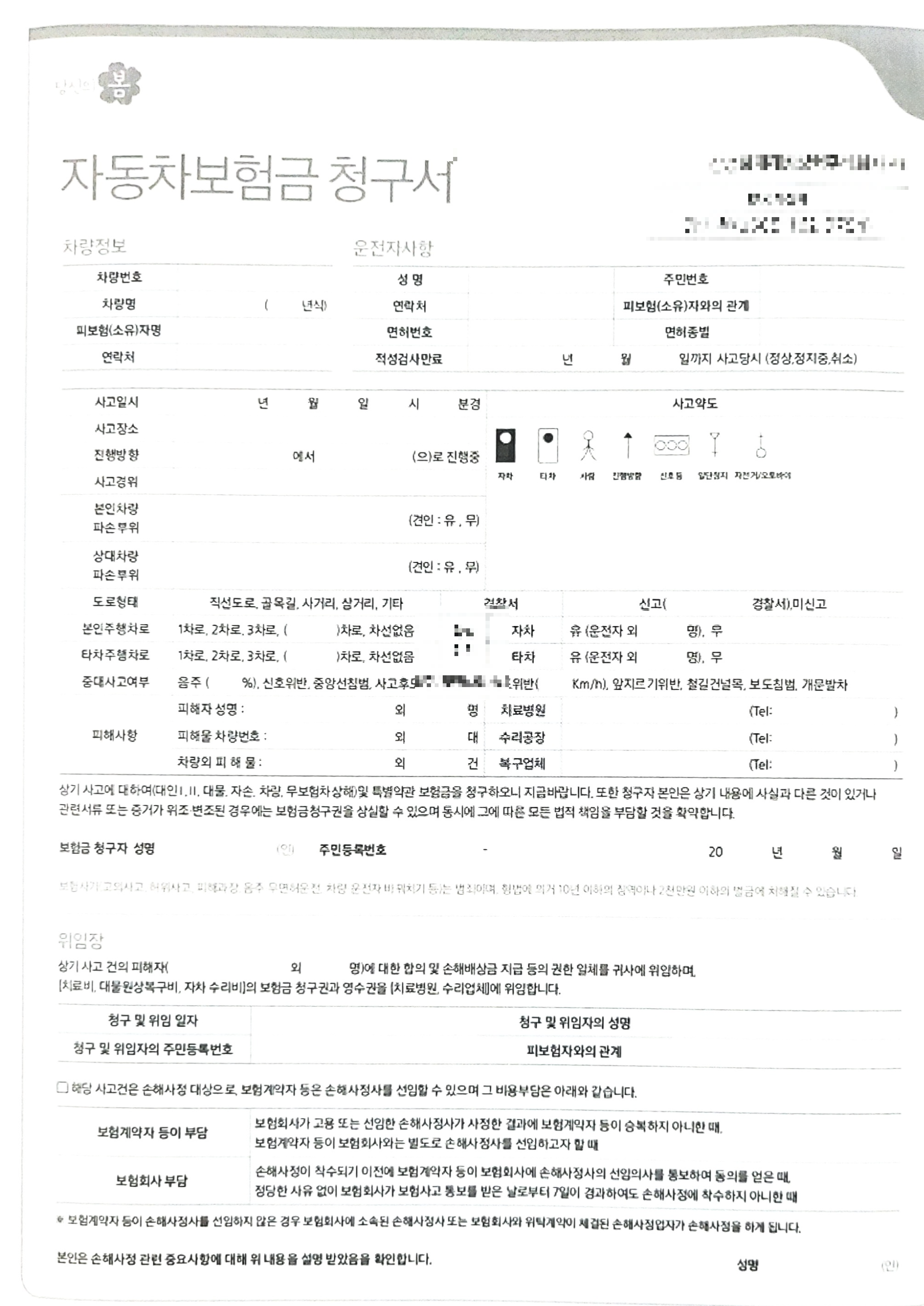 일단 보험회사에 사고접수 서류를 접수합니다. 기본적인 인적사항이랑 이런것들 적으면 되는데요